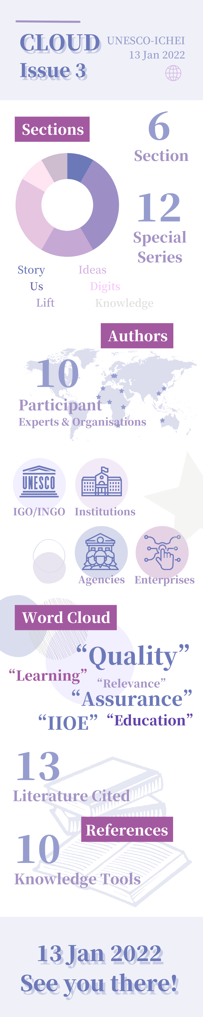The third issue of CLOUD focuses on Africa and West Asia Region, with the theme of "Back to the Basics: Quality Assurance for the Futures of Higher Education". Based on the outcome of the International Institute of Online Education (IIOE) Partnership Meeting 2021 (Africa and West Asia) and the International Institute of Online Education (IIOE) Quality Assurance 2.0 Consultation Meeting, the third issue focuses on the latest IIOE Quality Assurance 2.0 released by UNESCO-ICHEI, initiating a series of discussions around building, promoting, and supporting an ecosystem of institutions for online and blended teaching and learning (OBTL). The issue also recorded actions and experiences of IIOE's partner HEIs in Africa and West Asia to ensure continuity and quality of higher education during and beyond the COVID-19 pandemic, as well as good practices of how IIOE supported partner HEIs in West Asia and Africa in online and blended higher education and digital transformation.