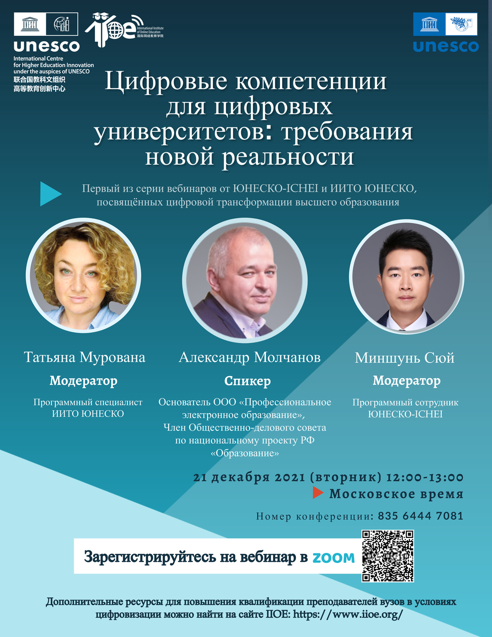 On 21th December 2021 at 12:00-13:00 (Moscow time, UTC+3), UNESCO-ICHEI and the UNESCO Institute for Information Technologies in Education (UNESCO IITE) co-organised the first Russian webinar session on higher education digital transformation, in empowering the higher education workforce in Russian-speaking regions.