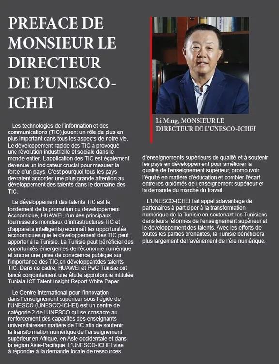 2021年3月16日,以数字化人才供需洞察为背景,由华为公司与普华永道合作编写,由联合国教科文组织高等教育创新中心(中国深圳)(下称“创新中心”)提供数字化教育改革实践与内容的《突尼斯ICT人才洞察白皮书》(下称《白皮书》)在华为突尼斯人才日正式发布。突尼斯通信技术与数字经济部长Mohamed Fadhel Kraiem、中国驻突尼斯大使张建国、华为公司突尼斯总经理林星硕等出席并致辞。