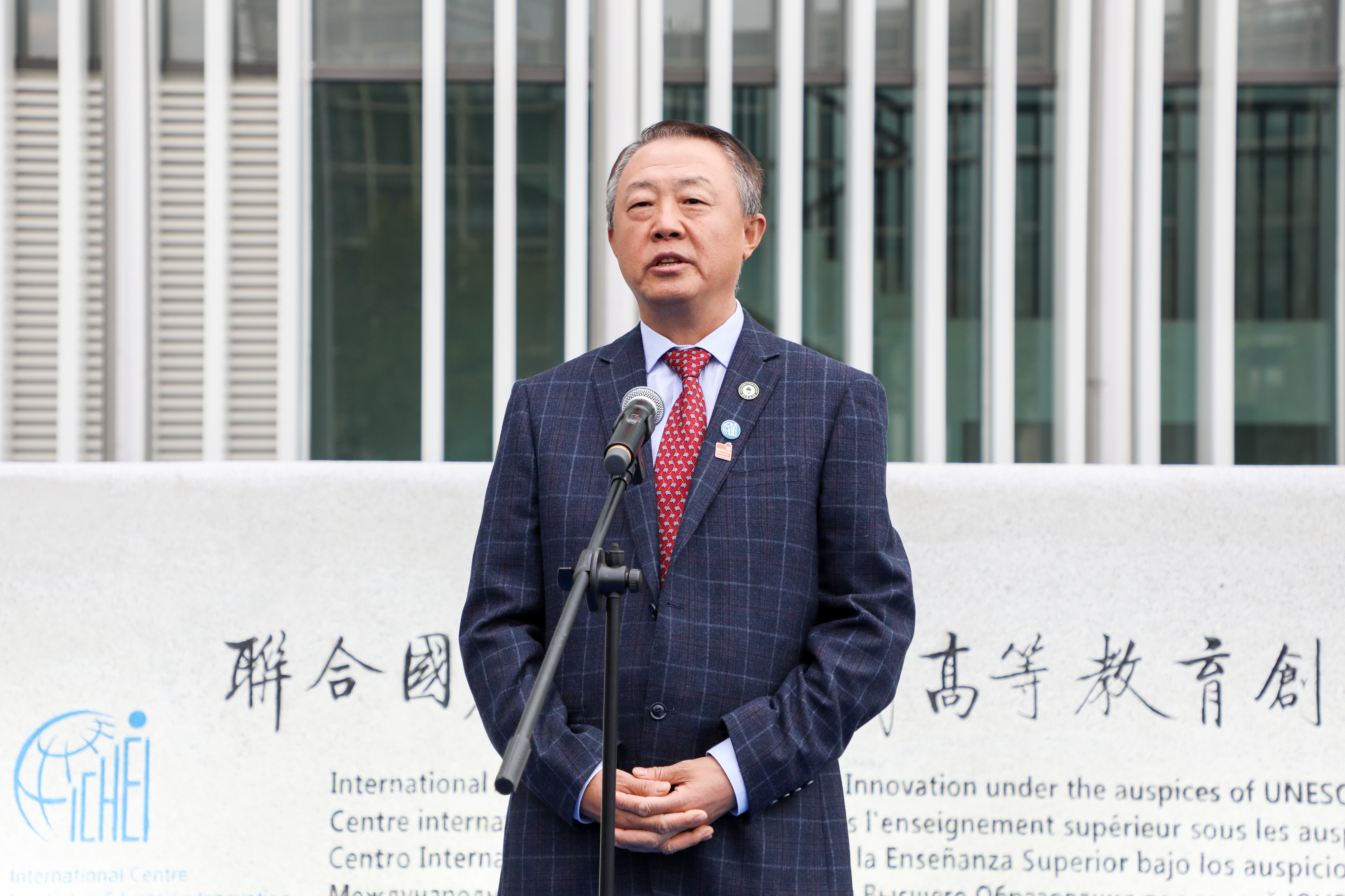 Prof. XUE Qikun delivering a speech Prof. XUE Qikun pointed out the inauguration of the inscription stone is the witness for UNESCO-ICHEI' efforts in promoting Shenzhen's globalization and serving the Belt and Road Initiative. He expressed his hope that UNESCO-ICHEI could further expand cultural and educational exchanges and facilitate China's going global in terms of culture and education. In the end, Prof. XUE Qikun delivered his best wishes for the future development of UNESCO-ICHEI.