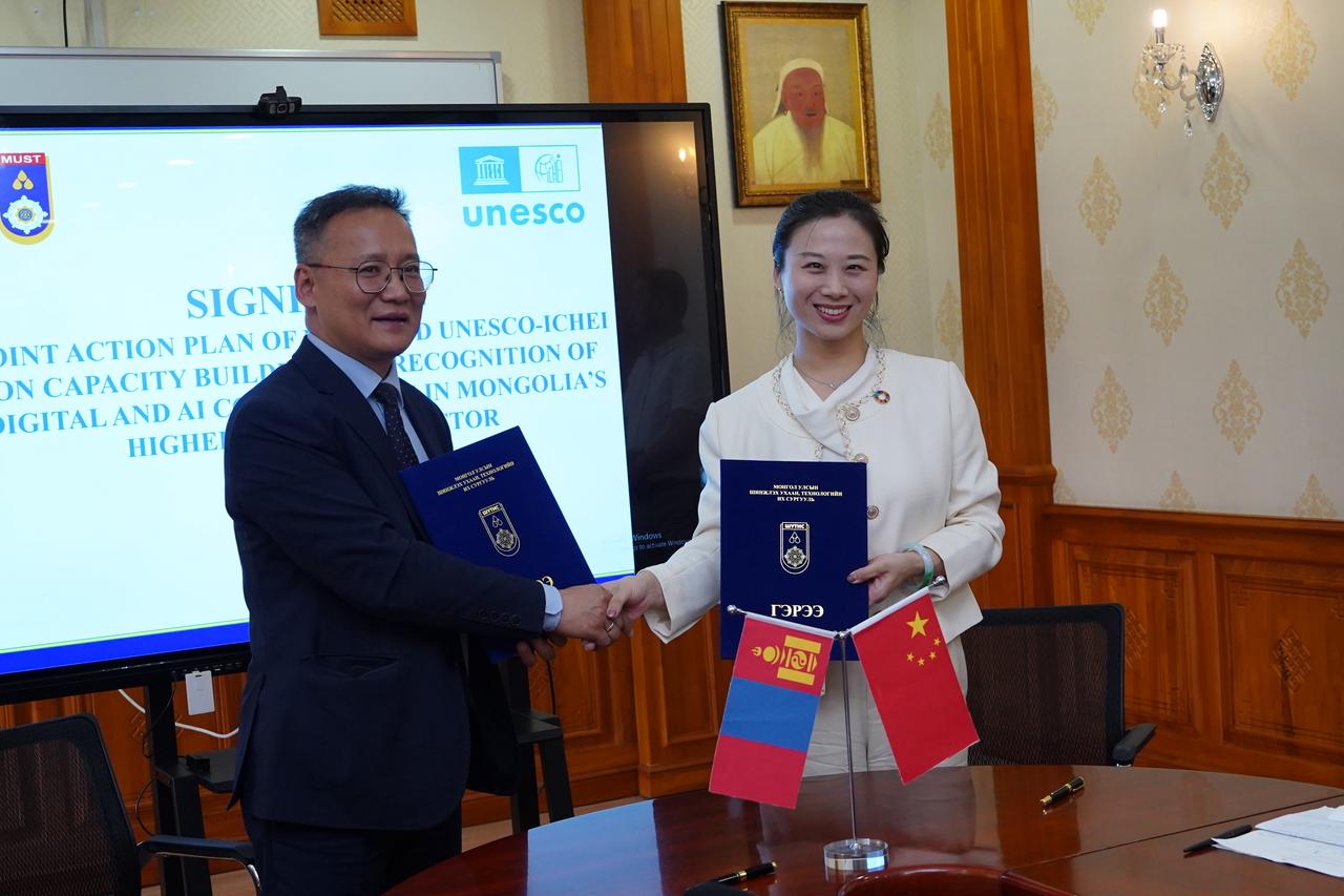 At MUST, UNESCO-ICHEI and MUST signed the "Joint Action Plan of IIOE Mongolia National Center and UNESCO-ICHEI on Capacity Building and Recognition of Digital and AI Competencies in Mongolia's Higher Education Sector 2025-2027". The IIOE Mongolia National Centre will focus on three strategic areas, which are digital skills development, AI competency enhancement, as well as micro-certification and recognition. By delivering localised training based on IIOE Micro-certification Project, the IIOE Mongolia National Centre will respond to Mongolia's pressing need for faculty development in higher education.