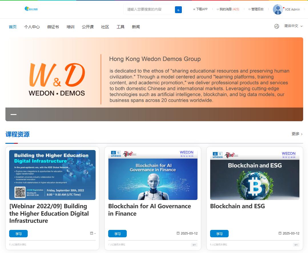 Hong Kong Wedon Demos Group officially established its institutional zone on the International Institute of Online Education (IIOE) and created its internal learning zone, which marks a new initiative by the International Centre for Higher Education Innovation under the auspices of UNESCO (UNESCO-ICHEI) and Hong Kong Wedon Demos Group in promoting the digital transformation of global education.