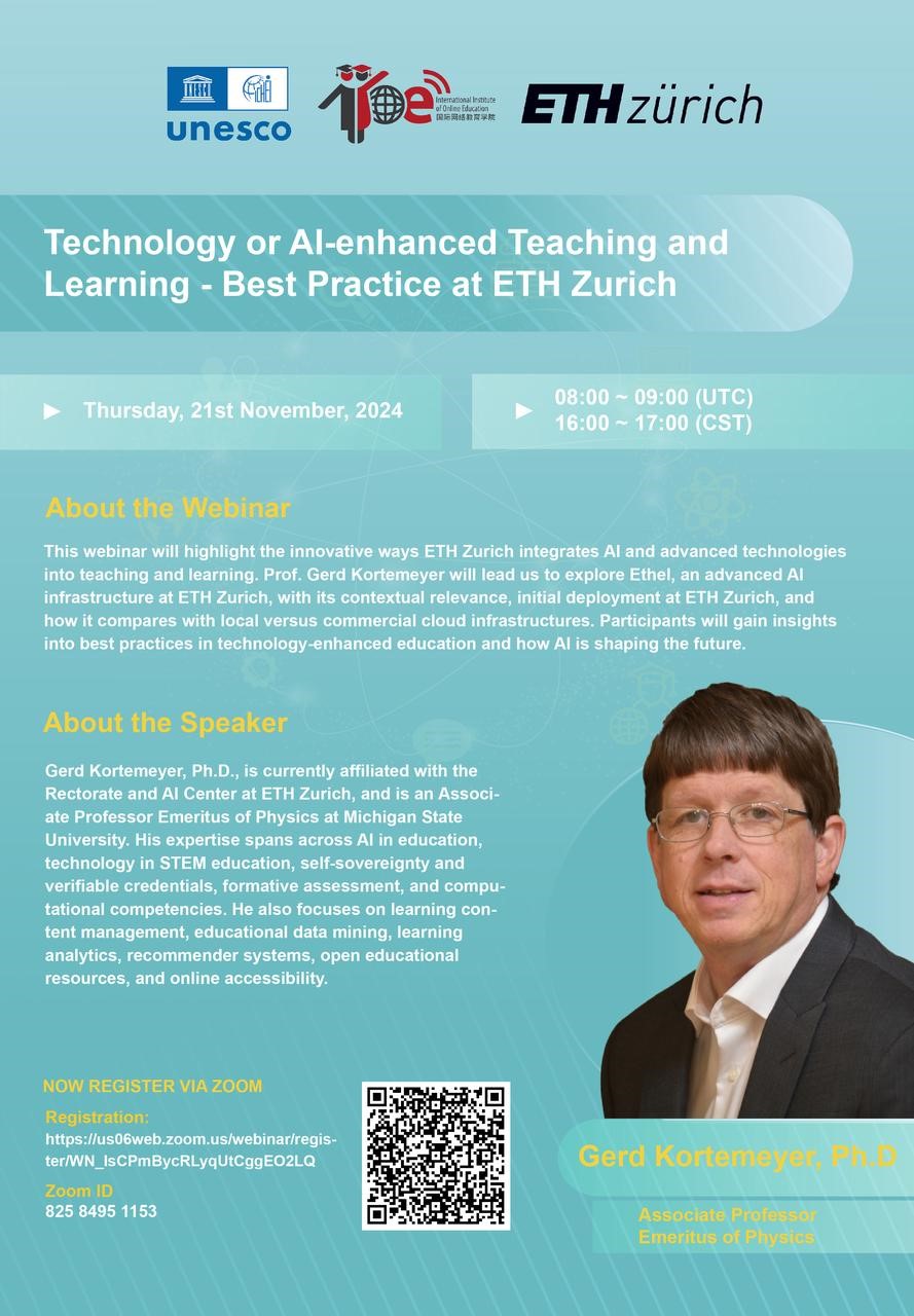 In the rapidly evolving wave of Artificial Intelligence (AI) technology, the education sector is undergoing profound transformation. How to integrate AI into teaching and administration to enhance learning efficiency and improve education quality has become a core topic of interest for educators worldwide. To explore these possibilities, UNESCO-ICHEI, in collaboration with Prof. Gerd Kortemeyer from ETH Zurich, will host a webinar titled “AI-enhanced Teaching and Learning - Best Practice at ETH Zurich”, uncovering the potential of AI to empower education.