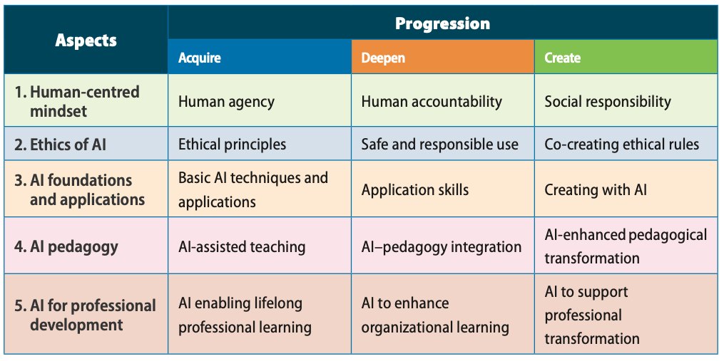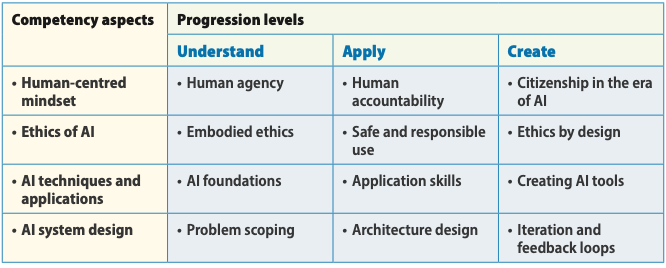 The UNESCO AI competency framework for students aims to help educators in this integration, outlining 12 competencies across four dimensions: Human-centred mindset, Ethics of AI, AI techniques and applications, and AI system design. These competencies span three progression levels: Understand, Apply, and Create. The framework details curricular goals and domain-specific pedagogical methodologies.
