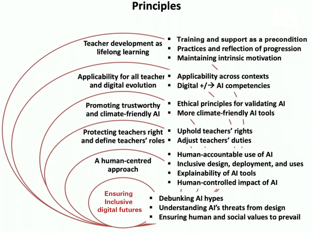 AI competency framework for teachers has six principles: ensuring inclusive digital futures, a human-centred approach to AI, protecting teachers' rights and iteratively (re)defining teachers' roles, promoting trustworthy and environmentally sustainable AI for education, ensuring applicability for all teachers and reflecting digital evolution, and lifelong professional learning for teachers.