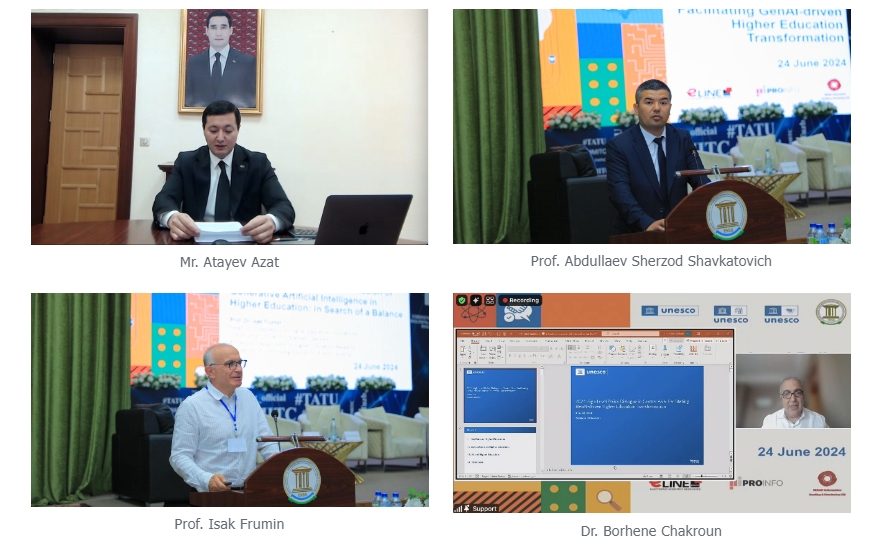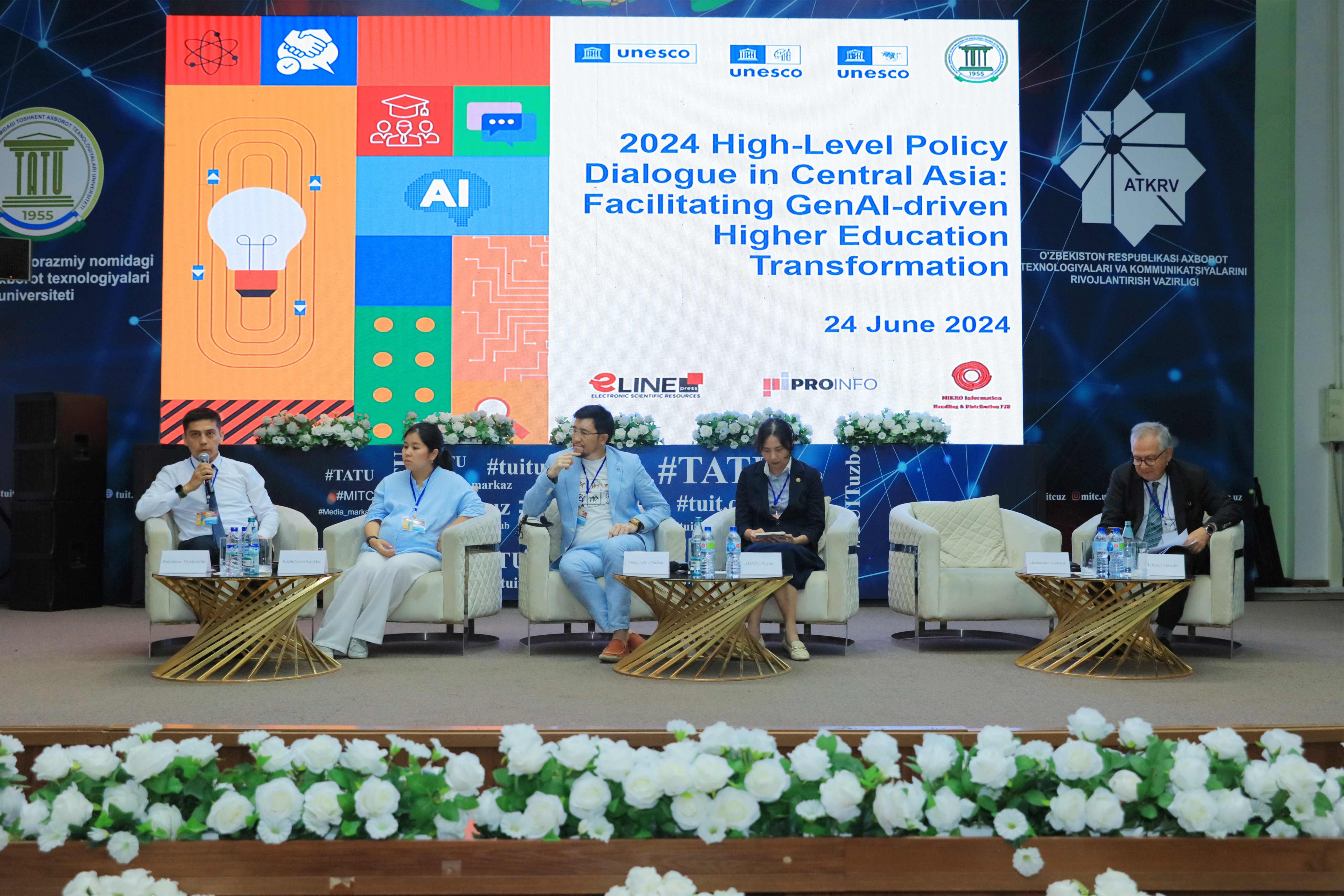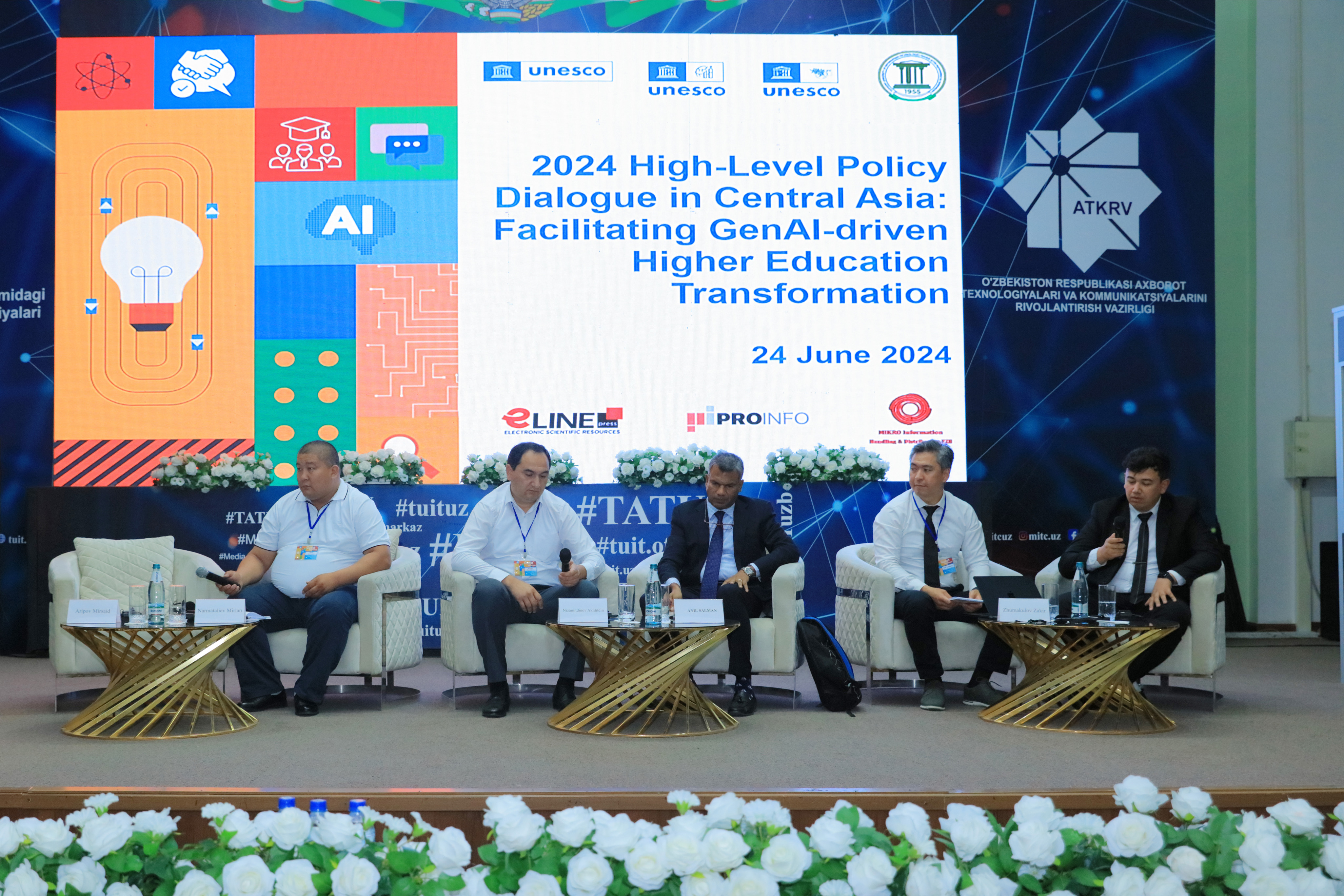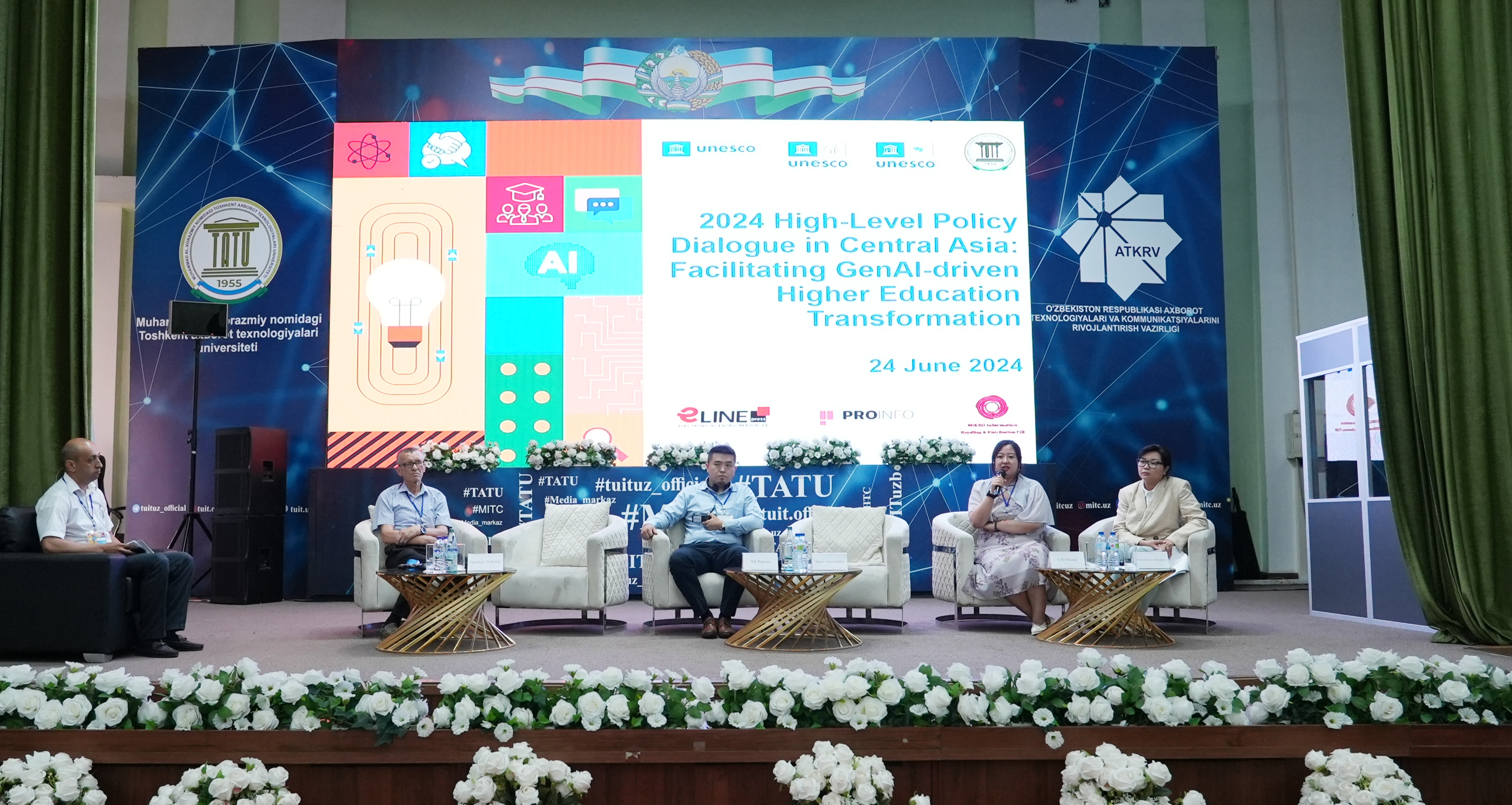On June 24, 2024, the High-Level Regional Policy Dialogue in Central Asia themed "Facilitating GenAI-driven Higher Education Transformation" was successfully held in Tashkent, Uzbekistan. The Policy Dialogue was co-organized by the Tashkent University of Information Technologies (TUIT, IIOE Uzbekistan National Center), the UNESCO Institute for Information Technologies in Education (UNESCO IITE), the UNESCO Almaty Regional Office (UNESCO Almaty), and the International Centre for Higher Education Innovation under the auspices of UNESCO (UNESCO-ICHEI). The event was supported by Uzbekistan's companies: ELINE Press Ltd. and PROINFO Ltd.