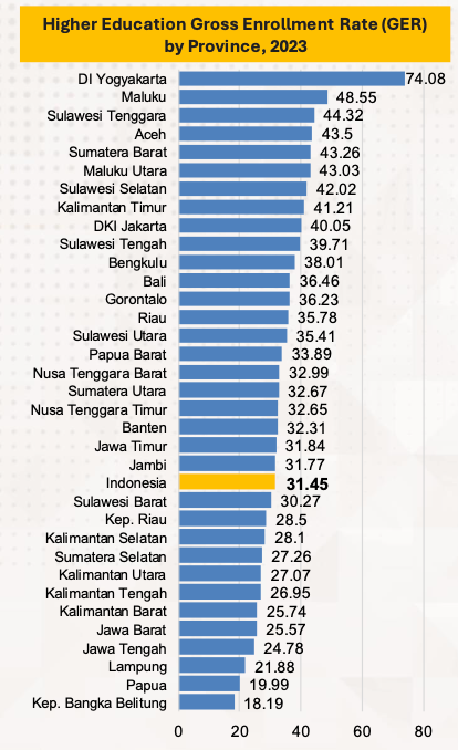 According to the Central Statistics Agency (BPS), the higher education gross participation rate in Indonesia rose from 13.10% in 2005 to 31.45% in 2023. However, this still reveals the limited access to high-quality higher education. Notably, the integration of AI with higher education is also undergoing unprecedented opportunities. Big Data Analytics Technology, Internet of Things, Digital Security, AI, and Digital Platforms are the technologies most likely to drive over 50% of industrial transformation and job creation potential. Various AI-driven applications theoretically have the potential to transform teaching, research, talent management, and institutional management. It also can achieve high-quality, equitable higher education and accelerate the realisation of educational inclusivity. Therefore, the curriculum and learning objectives in educational units must be modified in response to these developments to reflect the skills—including the usage of GenAI—that employers are looking for.
