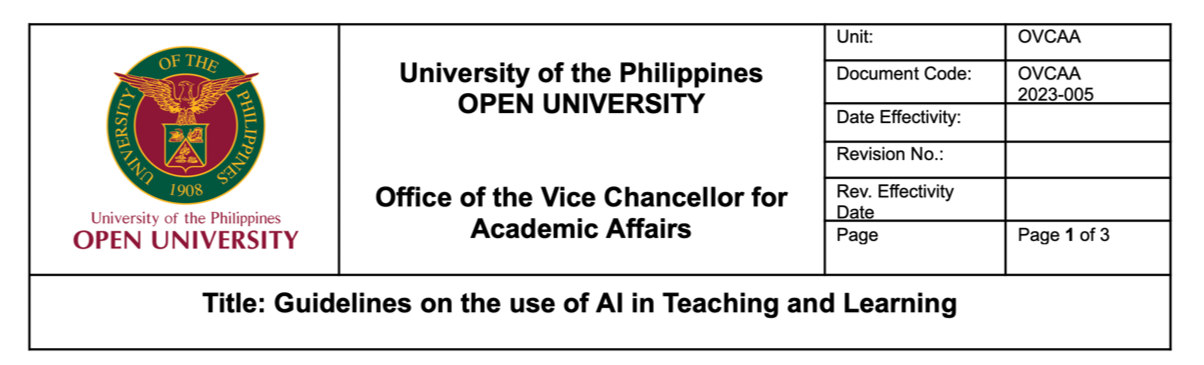 The University of the Philippines Open University (UPOU) pioneered in online teaching and learning and continues to play a leading role in the study and practice of open learning and distance education in the Philippines. With the development of AI technologies, UPOU is facing new challenges in terms of teaching quality, academic integrity, and ethical risks, and is attempting to redesign its teaching and learning activities and assessment methods to adapt to the impact of AI on education. Therefore, UPOU developed Guidelines on the Use of AI in Teaching and Learning to regulate the ethical use of AI. Teachers should pay attention to improving the effectiveness and quality of teaching when applying AI technology, meeting the diverse learning needs of students, and cultivating students' lifelong learning and critical thinking skills. Students should properly apply AI to search for information, identify data sources, and eliminate plagiarism and other academic misconduct. In addition, UPOU will provide training for teachers and enhance their ability to apply AI technology through Open Education Resources (OERs).