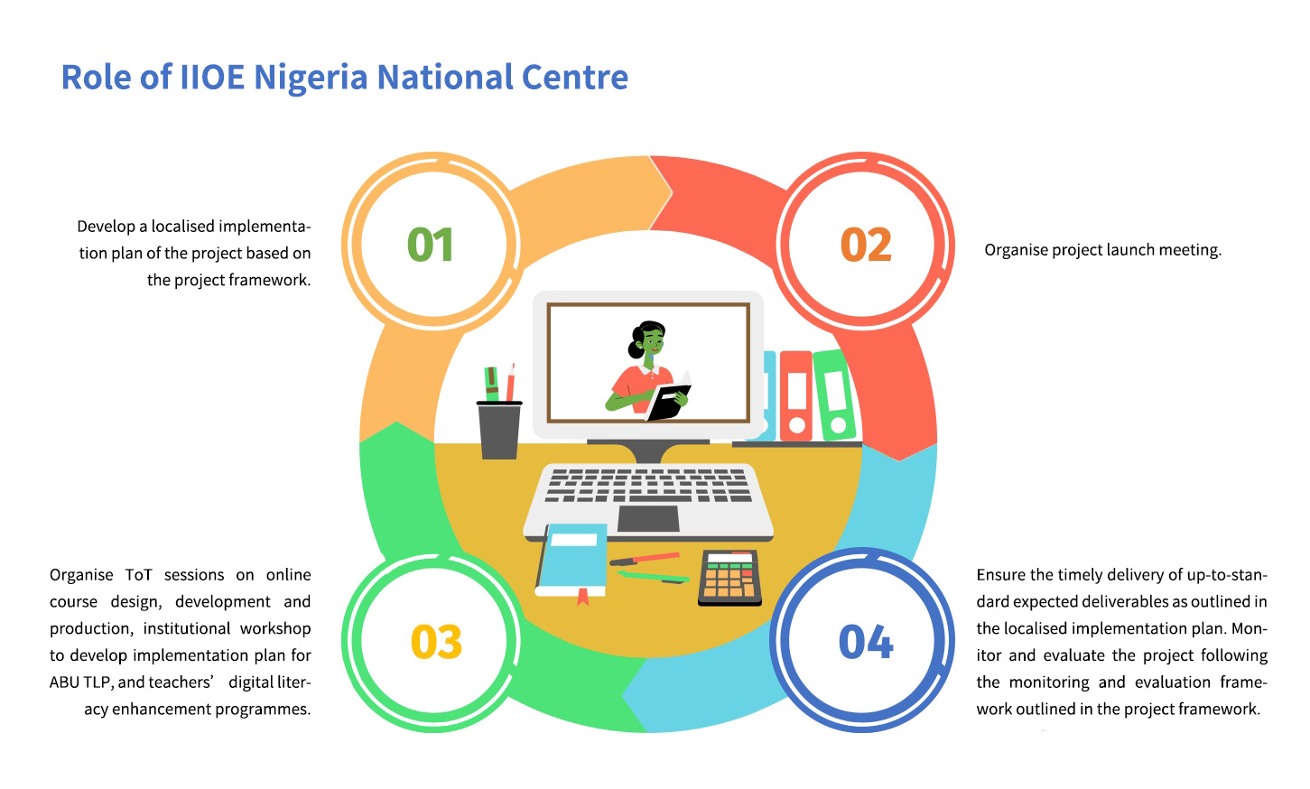 As IIOE Nigeria National Centre, Ahmadu Bello University (ABU) is committed to supporting the implementation of institutional policies for digital teaching and learning in Nigerian HEIs. The specific practices include designing and implementing the comprehensive plan of the Teaching and Learning Policy; enhancing teachers' digital teaching and learning capacities and improving the quality of online courses; supporting the design, development, and production of quality digital content; providing teaching personnel with professional training; supporting ABU in implementing its Teaching and Learning Policy and facilitating coordination among departments and units to promote the development of digital teaching and learning in depth.