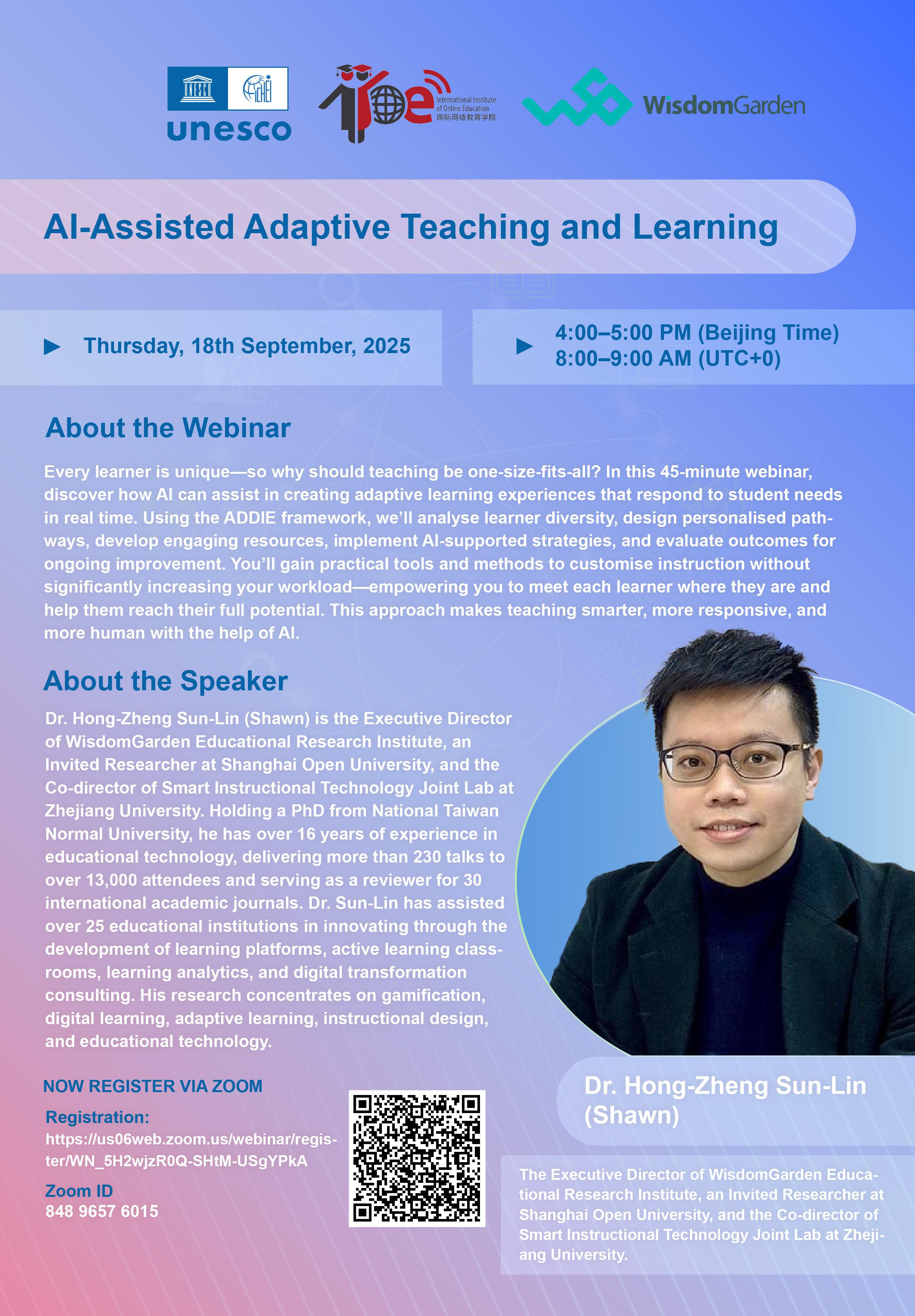 为此,国际网络教育学院(IIOE)将于2025年9月18日举办“人工智能支持下的个性化教与学”主题公开课。本次公开课将助力教育工作者深入理解如何运用人工智能技术,设计出以学习者为中心的灵活教学方案,使教学更智能、更高效、更富人文关怀。