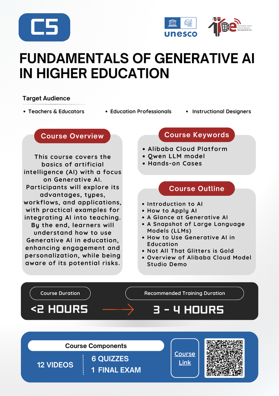 2024年12月19日,由国际网络教育学院(IIOE)和企业伙伴阿里云联合发起的两门课程正式在IIOE平台上线,旨在帮助发展中国家高等教育教师和领导者灵活运用生成式AI于教学和管理实践中。相关课程为IIOE在线学习平台提供的开放教育资源,面向公众免费开放。
