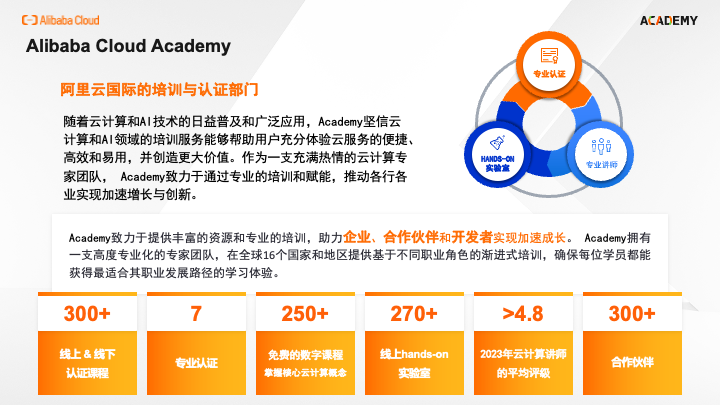 Alibaba Cloud Academy是阿里云的国际培训和认证部门,提供超过300门线上和线下培训课程,帮助客户、合作伙伴和开发者提升云计算技能。相关在线培训课程包括专业认证课程、产品能力认证课程和免费 e-Learning 课程,可满足客户多样的学习需求。