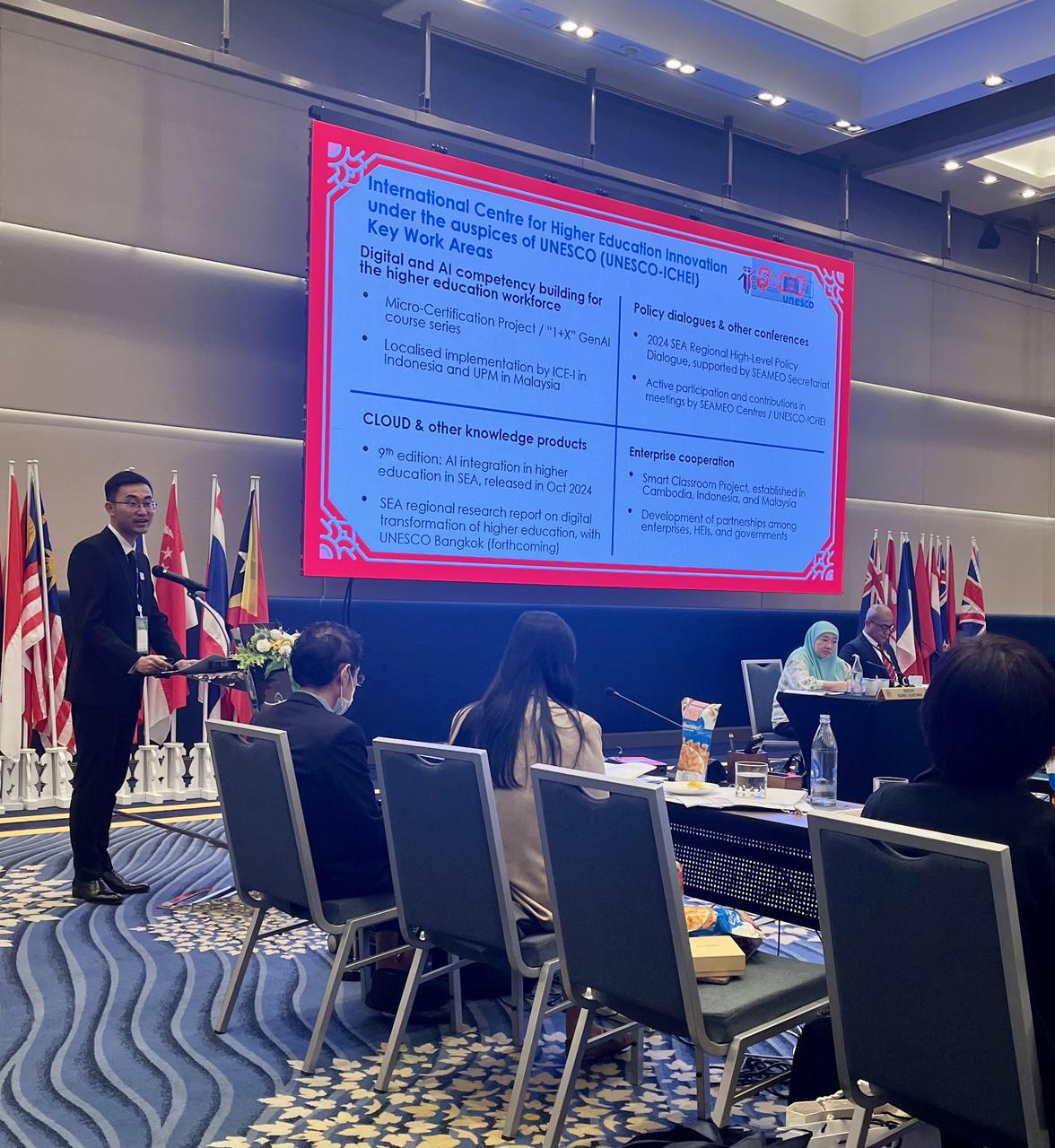 2024年11月27日,第47届东南亚教育部长组织(SEAMEO)高级官员会议(HOM)在泰国曼谷召开。本次会议由东南亚教育部长组织秘书处发起,与会代表包括来自东南亚教育部长组织成员国的高级官员,来自准成员国、附属成员和合作伙伴的代表,以及东南亚教育部长组织秘书处和区域中心/网络的主任及其高级工作人员。联合国教科文组织高等教育创新中心(中国深圳)(以下简称“创新中心”)国际伙伴项目部临时负责人曹子安先生受邀参加此次会议,并介绍了创新中心在推动东南亚高等教育发展方面的工作。