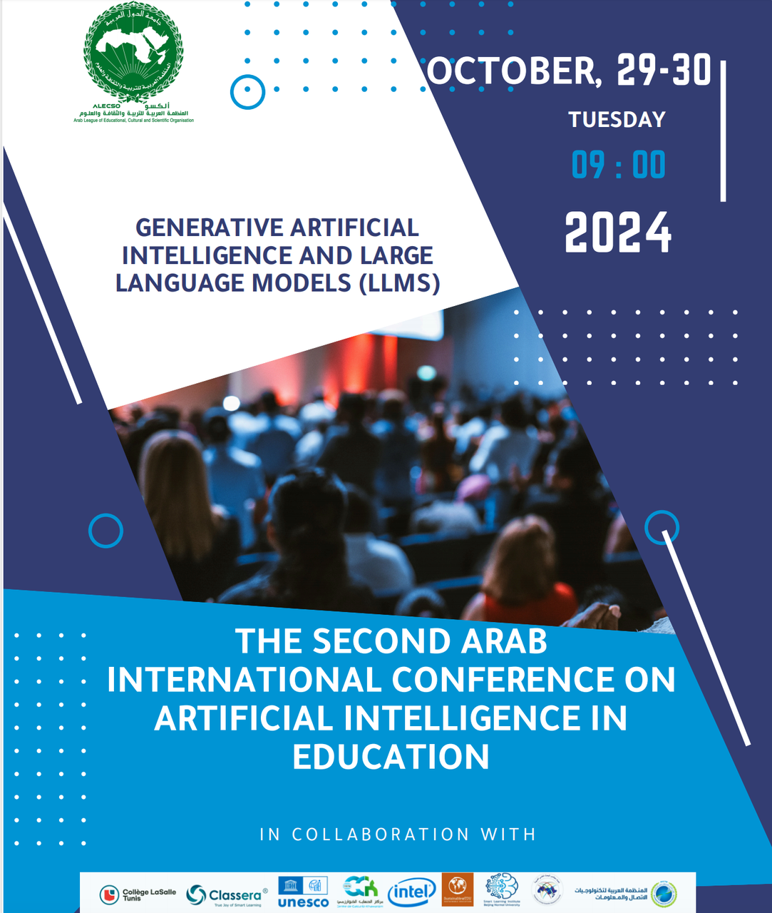 2024年10月29日至30日,由阿拉伯联盟教育、文化及科学组织(ALECSO,以下简称“阿拉伯教科文组织”)主办的第二届人工智能与教育阿拉伯国际会议在突尼斯ALECSO总部以线上线下结合的形式成功举办,联合国教科文组织高等教育创新中心(中国深圳)(以下简称“创新中心”)为会议联合主办方。阿拉伯教科文组织总干事Mohamed Ould Amar教授、阿拉伯教科文组织ICT部门主任Mohamed Jemni教授、突尼斯高等教育和科学研究部代表Bellamine Bensaoud Narjès教授和Azedine Zagrouba教授,埃及高等教育和科学研究部顾问Sherif Keshk教授,阿联酋阿拉伯数字经济联盟副秘书长Ayman Ghoneim教授等出席了会议,来自全球多个地区的联合国教科文组织代表、企业代表、阿拉伯地区高等院校机构代表及教育领域顶级学者受邀参会