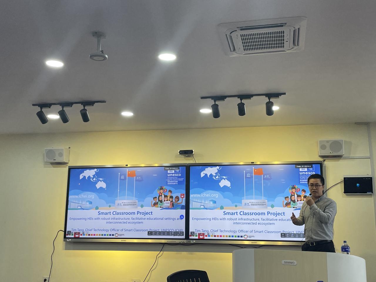 2024年9月25日至10月1日,联合国教科文组织高等教育创新中心(中国深圳)(以下简称“创新中心”)智慧教室项目首席技术官唐湘政与希沃项目经理俞奥博,赴尼泊尔特里布万大学进行智慧教室安装并开展培训,将中国先进教育技术方案引进高山之国,获得了校方高度认可。