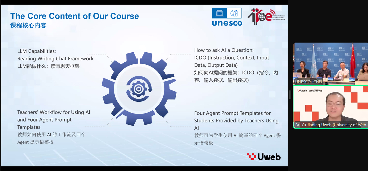 Uweb创始人兼校长、中国通信工业协会区块链专委会共同主席、中国移动通信联合会元宇宙产业委员会执行主任于佳宁博士详细讲解了第三门课程“使用人工智能进行教学:实用技巧”。于博士从课程的目的、大纲及核心内容进行了系统介绍。他指出,生成式人工智能技术将可能彻底变革当前的学习与教育模式。基于此,课程提供了如何在教学和学习中使用大规模语言模型(LLMs)的具体指导,包括教师提示词技巧,以及将GenAI整合进课堂的注意事项和实际操作示范。此外,于博士还强调了人工智能、区块链技术及其在Web3.0时代融合的重要性,并详细阐述了课程的四大核心内容。