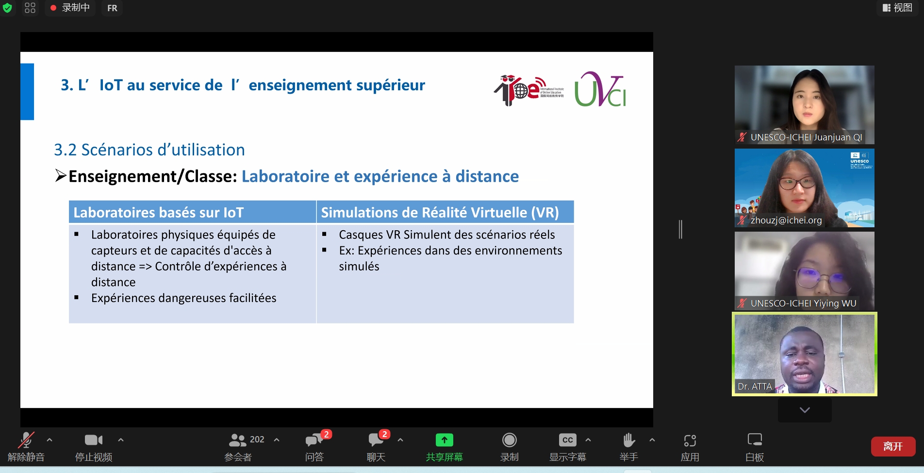 联合国教科文组织高等教育创新中心(中国深圳)(以下简称“创新中心”)将在IIOE平台上推出法语系列培训,内容涵盖物联网、云计算和区块链在教育中的前沿应用。此举旨在提升非洲法语国家教师的数字化能力,优化教学实践,以满足IIOE平台上广大教师学员的多元化需求。此次法语系列培训将持续三个月,从4月的物联网培训开始,到5月的云计算培训,再到6月的区块链培训,每一场培训都承载着探索数字化教育未来的重要使命。所有这些精彩培训内容都可在IIOE平台(iioe.org)上一键获取。 作为系列培训的首站,4月25日星期四北京时间17:00-18:00 (UTC+8),IIOE物联网培训公开课以直播形式正式亮相。这场公开课邀请了科特迪瓦虚拟大学的Dr. Amanvon Ferdinand ATTA作为特邀嘉宾,为学员带来了精彩纷呈的分享。他深入浅出地讲解了物联网的基本概念,详细阐述了物联网如何服务于高等教育,探讨了高等教育中运用物联网所面临的挑战,并介绍了IIOE法语系列培训的物联网培训计划。Dr. Amanvon Ferdinand ATTA的分享不仅为学员们带来了前沿的见解和启示,也为他们未来的学习和