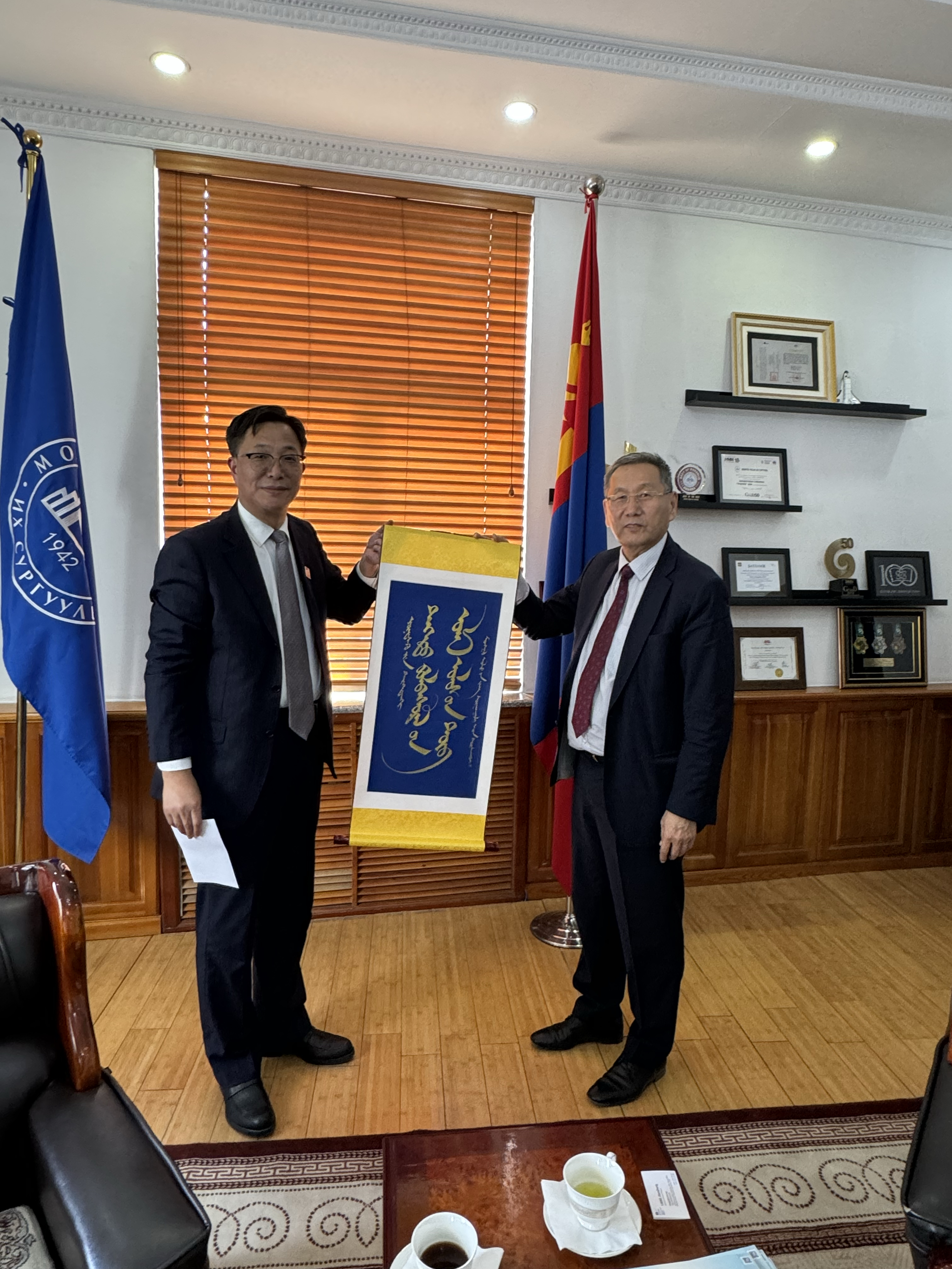 创新中心常务副主任梁建生教授(左)和蒙古国立大学校长 Badarch Dendev 教授(右)