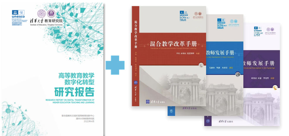 创新中心与清华大学教育研究院联合开展“高等教育数字化转型” 系列研究,形成了《高等教育教学数字化转型研究报告》一份报告和《混合教学改革手册》、《高等教育教师教学能力发展手册》、《职业教育教师教学能力发展手册》三本手册(“3+1”项目,即3本手册和1份研究报告)。三本手册的中文版已由清华大学出版社于2023年下半年正式出版,英文版已由斯普林格出版社(Springer)同期正式出版。