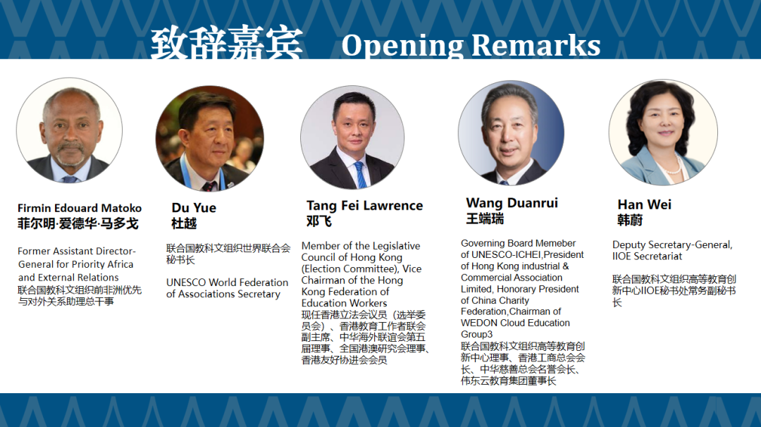会议首先由联合国教科文组织世界联合会秘书长杜越主持,之后联合国教科文组织前非洲优先与对外关系助理总干事菲尔明·爱德华·马多戈(FirminEdouard Matoko)、香港立法会议员邓飞、联合国教科文组织高等教育创新中心理事、香港工商总会会长、伟东云教育董事长王端瑞先生、IIOE秘书处常务副秘书长韩蔚分别进行开幕致辞。