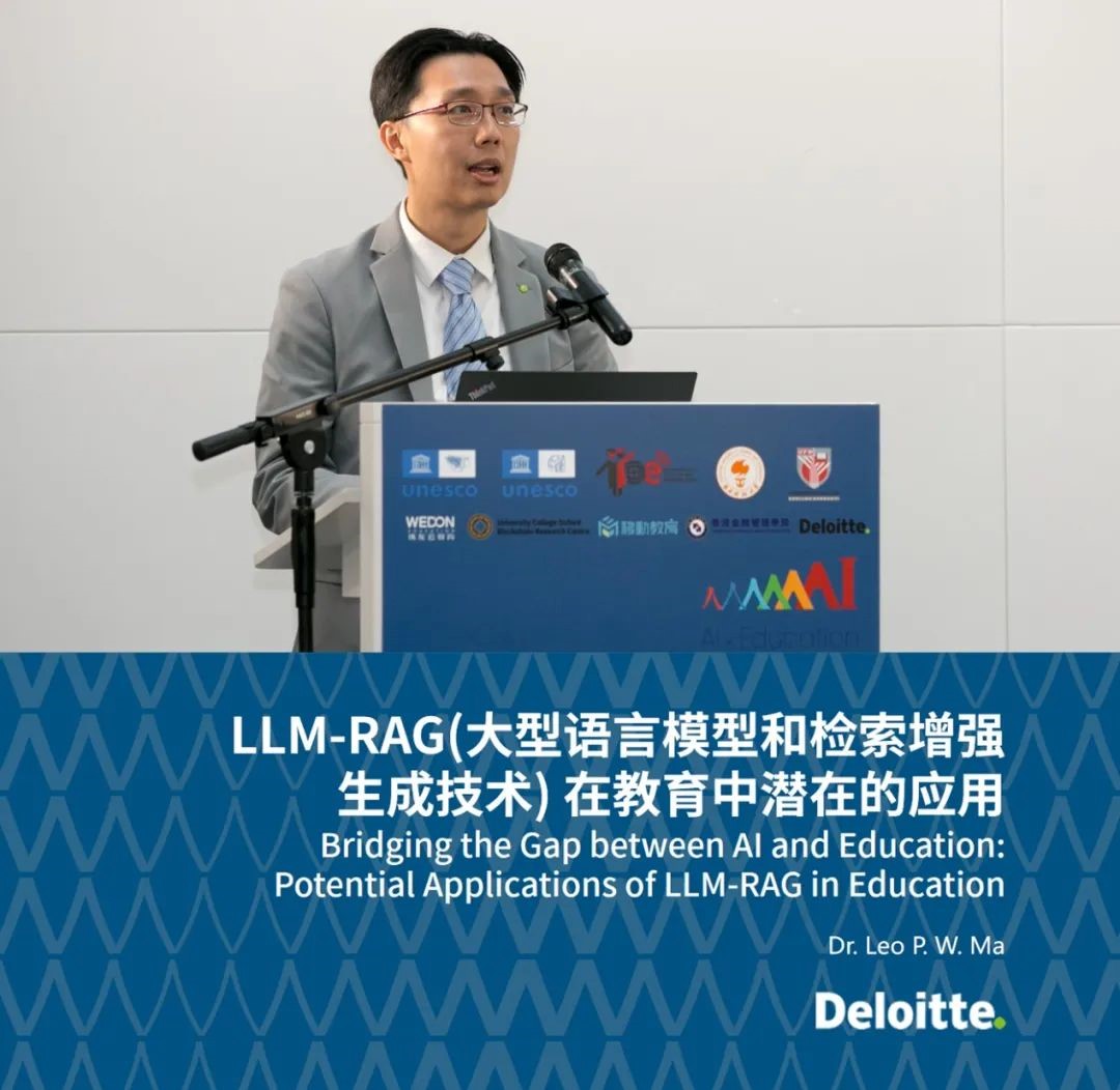 德勤AI研究院(香港)院长Leo Ma以《LLM-RAG(大型语言模型和检索增强生成技术)在教育中潜在的应用》探讨了LLM-RAG的技术要点,以实例向大家分享了RAG的应用要点,以及LLM在教育领域的它有可能通过提高学习成果来彻底改变教育培养对复杂主题的深入理解,并为每个学生提供个性化的学习体验。