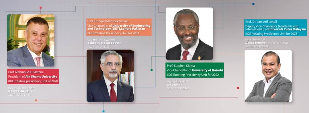 IIOE轮值主席制度是IIOE治理结构中的重要角色,自成立时便已设立,每年在不同次区域的高校之间轮换。自2019年IIOE启动以来,4所IIOE伙伴院校已经先后担任了轮值主席单位,包括2020年首届IIOE轮值主席单位埃及艾因夏姆斯大学,2021年IIOE轮值主席单位巴基斯坦拉合尔工程技术大学,2022年IIOE轮值主席单位肯尼亚内罗毕大学,2023年IIOE轮值主席单位马来西亚博特拉大学。