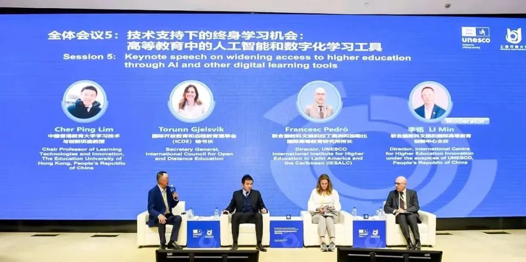 2023年10月19-20日,由联合国教科文组织终身学习研究所和上海开放大学共同组织的“促进高等教育终身学习会议”在上海成功召开。联合国教科文组织高等教育创新中心(以下简称:“创新中心”)主任李铭教授受邀出席此次会议并主持全体会议5:“技术支持下的终身学习机会:高等教育中的人工智能和数字化学习工具”。创新中心国际网络教育学院(以下简称“IIOE”)首席专家,中国香港教育大学学习技术与创新讲席教授林质彬分享了题为“数字技术推动包容和公平的优质高等教育,加强教师与高校领导者能力建设”的主旨演讲,并与国际开放与远程教育协会(ICDE)秘书长Torunn Gjelsvik女士,以及联合国教科文组织拉丁美洲和加勒比国际高等教育研究所主任Francesc Pedro先生展开讨论。