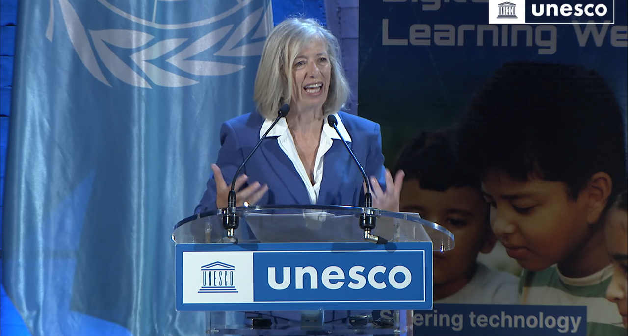 2023年9月5日上午,联合国教科文组织首届数字学习周(以下简称“数字学习周”)开幕式在巴黎总部举行。此次会议采取线上与线下相结合的方式,将全球教育工作者、管理者、决策者、公私营部门的利益相关者齐聚于此,共同探讨数字学习的新动态。 会议开幕 教科文组织教育助理总干事斯蒂芬妮亚·贾尼尼(Stefania Giannini)女士在开幕致辞中提到:随着生成式人工智能在全世界范围内广泛铺开使用,这促使我们思考,在教育中需要革新哪些能力?我们该如何支持教师获取并传授相关能力?如何评价和提升对应的教学模式?以及,人的智力意味着什么?尤其是当人与人工智能处于同一时空下,人类该如何主导学习。目前,国际社会对生成式人工智能应用于教育的关注与日俱增,中国是唯一一个发布了相关规范性框架文件的国家。教科文非常关注"AI-教育"的重要性,无论技术处于何种发展阶段,我们应保障教育作为一项基本人权,并倡导教师和学习者获取数据和培养信息素养,从而充分应对未来的机遇和挑战,促进不同文化、不同世界观的交流与融合。 教科文组织教育助理总干事斯蒂芬妮亚·贾尼尼(Stefania Giannini)致辞 国际电信联盟(I