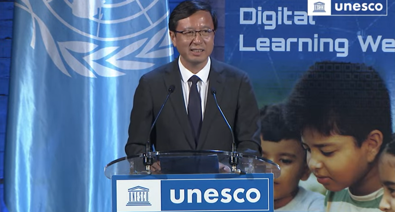 中国教育部副部长、中国联合国教科文组织全国委员会主任陈杰先生出席了今天的开幕式,并在“数字未来与平台社会:对教育的影响”话题讨论中,中国政府对于数字教育高度重视,并设定了目标、路径和相应的策略,同时他也强调了中国智慧教育平台在提升教师和学生能力方面的重要性,肯定了数字学习平台的重要意义,表示中国期待进一步与教科文合作,共同推动数字的未来。