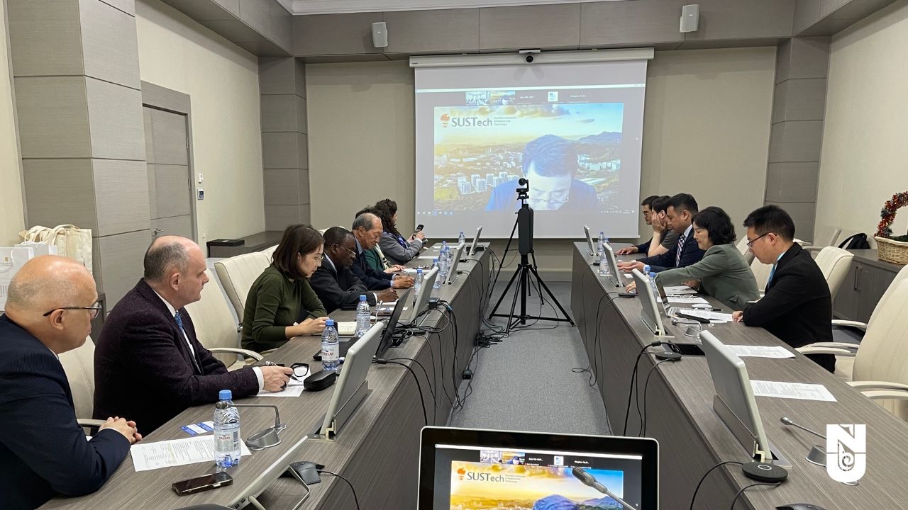 纳扎尔巴耶夫大学校长 Shigeo Katsu 先生、南方科技大学副校长兼总务长鲁春教授(线上)、创新中心常务副主任韩蔚教授分别代表三方出席了此次会谈。Shigeo Katsu 校长首先对创新中心代表到访学校表示了欢迎,并向与会嘉宾介绍了纳扎尔巴耶夫大学的学校特色、办学成就、发展规划,并表示了对三方未来合作的热切期待。