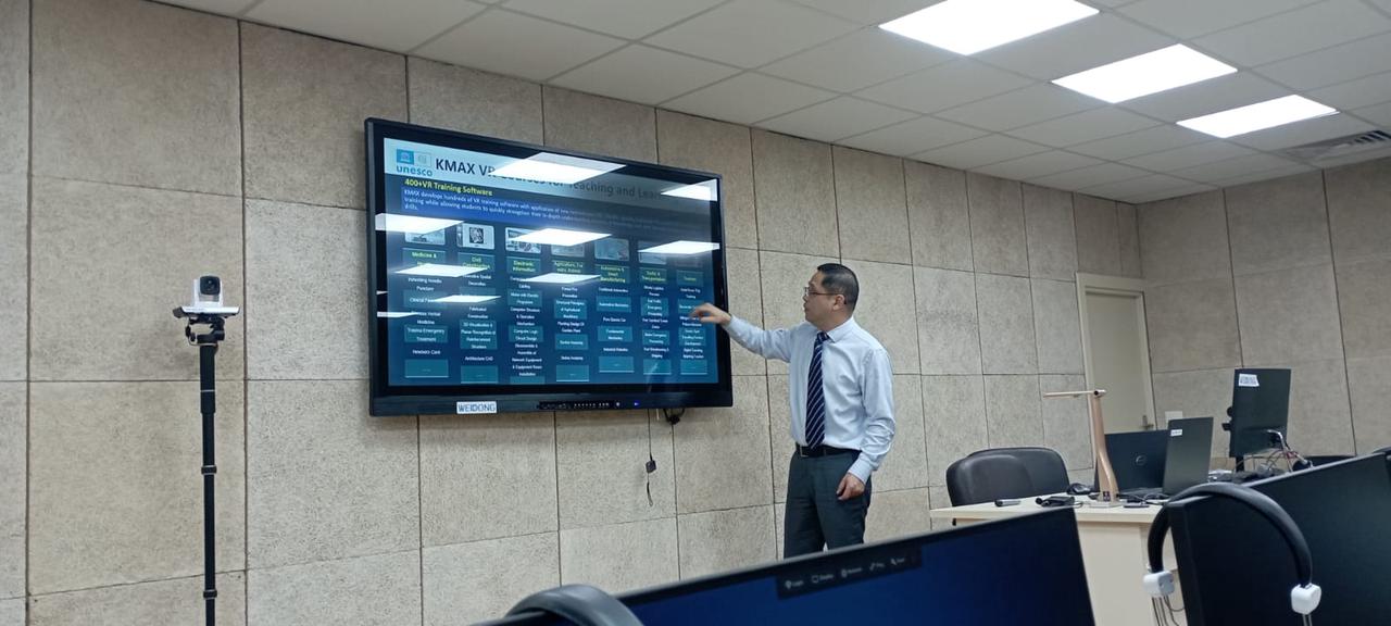 2023年3月16日,联合国教科文组织高等教育创新中心(以下简称“创新中心”)代表团拜访艾因夏姆斯大学工程学院,并考察艾因夏姆斯大学的智慧教室,工学院副院长接待了代表团,智慧教室团队汇报了智慧教室的使用情况,创新中心与艾因夏姆斯大学就下一步智慧教室使用规划和升级进行了交流,计划引入虚拟现实技术增强智慧教室的功能和体验,赋能高校教师专业发展。创新中心与艾因夏姆斯大学在智慧教室合影创新中心与艾因夏姆斯大学在工程学院合影创新中心将与伙伴企业合作引入虚拟现实(VR)技术,增强智慧教室的功能和体验,赋能高校教师专业发展,为亚非发展中国家高校带来新技术、新应用与新生态。创新中心将与艾因夏姆斯大学合作进行虚拟现实技术试点,引入VR教学平台、VR课程资源、VR硬件设备等,利用VR技术为教师提供沉浸式的专业培训和实践机会,提升教师的数字化素养和创新能力。此外,双方还将共同探索如何将VR技术与智慧教室相结合,为学生提供更丰富、更生动、更有效的学习体验。创新中心主任助理兼高等教育数字化转型研究所代理所长吕锋先生介绍虚拟现实技术及应用艾因夏姆斯大学智慧教室于2020年1月正式落成,设在艾因夏姆斯大学工程学院,