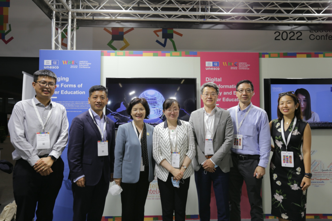 当地时间5月18日下午,中国常驻联合国教科文组织代表团参赞遇晓萍女士在会议期间到访创新中心在世界高教大会展区与华为联合设立的展台。遇晓萍参赞对创新中心参与世界高教大会并主办深圳信托基金结题会、IIOE圆桌论坛、中心工作成果展览等活动表示祝贺,并对创新中心积极组织高等教育领域国际合作,推动高等教育数字化转型的有关工作成果表示赞许。遇晓萍参赞还与华为代表团在展台现场就华为与创新中心联合开展的公益性教育合作表示肯定。 遇晓萍参赞与创新中心及华为代表团合影