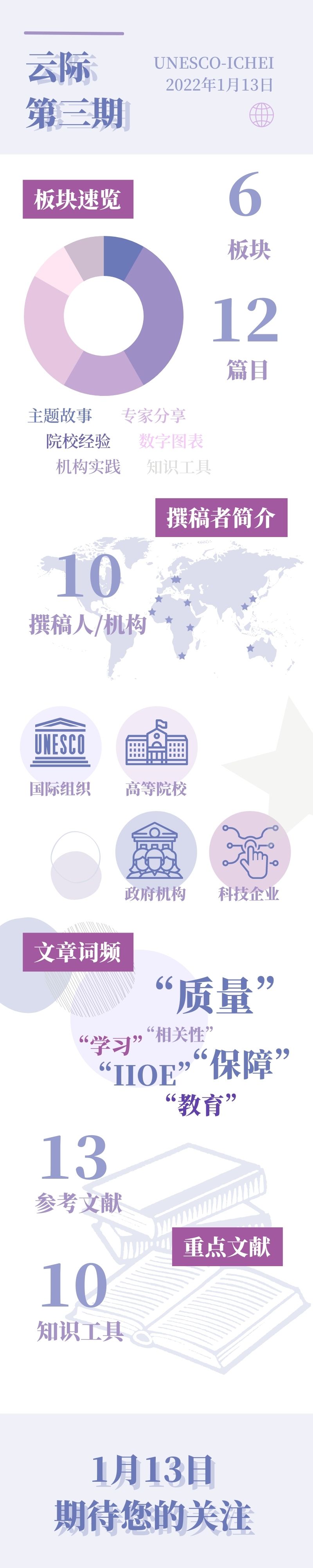 2022年1月13日,联合国教科文组织高等教育创新中心(中国深圳)(简称“创新中心”)旗舰刊物《云际》第三期正式全球发布,本期主题为“返璞归真:质量保障助力高等教育的未来”。在线阅读 期刊下载 《云际》 没有边界的知识连接者 《云际》是创新中心自2021年开始创办的季度性刊物。“云际”寓意全球以信息通信技术(ICT)驱动的云端交流与互通。本刊旨在通过传播与全球高等教育数字化转型相关的知识、项目动态、数据与最佳实践,搭建联通全球高等教育工作者的交流平台。《云际》第三期有来自埃及、摩洛哥、尼日利亚、乌干达、中国、南非、澳大利亚、塞内加尔(排名不分先后)等八组高等教育机构、企业等利益相关方以及联合国教科文组织高等教育处的专家参与协同创作。第三期主题: 返璞归真:质量保障助力高等教育的未来可用语言: 教科文组织六种官方语言——中、英、法、阿、俄、西《云际》第三期聚焦西亚非洲地区,以“返璞归真:质量保障助力高等教育的未来”为主题,在2021年2021年国际网络教育学院合作伙伴会议(西亚非洲)和国际网络教育学院(IIOE)质量保障2.0咨询会议成果的基础上,以创新中心最新发布的《IIOE质量保障2