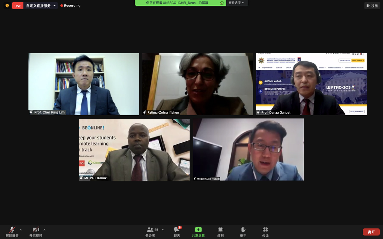 来自西亚、非洲、亚太地区的专家学者、高等院校机构代表、教育官员和政策制定者围绕“如何为以在线混合式教学驱动的未来高等教育创造良好的政策环境”进行了圆桌论坛,联合国教科⽂组织亚太地区教育局(曼⾕) 教育创新与技能开发部(EISD)主任汪利兵博⼠主持讨论。斯里兰卡高等与职业教育委员会副总干事 Janaka Jayalath博士、吉尔吉斯斯坦教育科技部教育学院副校长、赞比亚科技部规划与信息主任 Succeed Mubanga 先生以及乌干达马克雷雷大学计算机与信息技术学院院长、信息通讯技术与国家规划部第四次工业革命技术特别工作组专家成员 Tonny Oyana 教授在讨论中提到了学校应对疫情所采取的相关策略的议题,指出了为了应对疫情所带来的教学挑战,高等教育机构应着重建设其强大的网络和数字基础设施。此次政策圆桌论坛成效显著,发出了通力合作应对挑战、营造未来高等教育良好政策环境的积极信号。