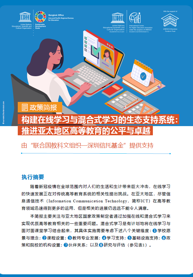 在“联合国教科文组织-深圳信托基金”(简称“深圳信托基金”)支持下,《“构建在线学习与混合式学习的生态支持系统:推进亚太地区高等教育的公平与卓越”政策简报》(简称《政策简报》)于近日正式发布。该简报由联合国教科文组织高等教育创新中心(中国深圳)(简称“创新中心”)与联合国教科文组织曼谷办事处、香港教育大学、澳大利亚科廷大学、柬埔寨金边皇家大学、马来西亚博特拉大学和斯里兰卡科伦坡大学的相关同事以及亚太地区领域内的专家学者合作完成。