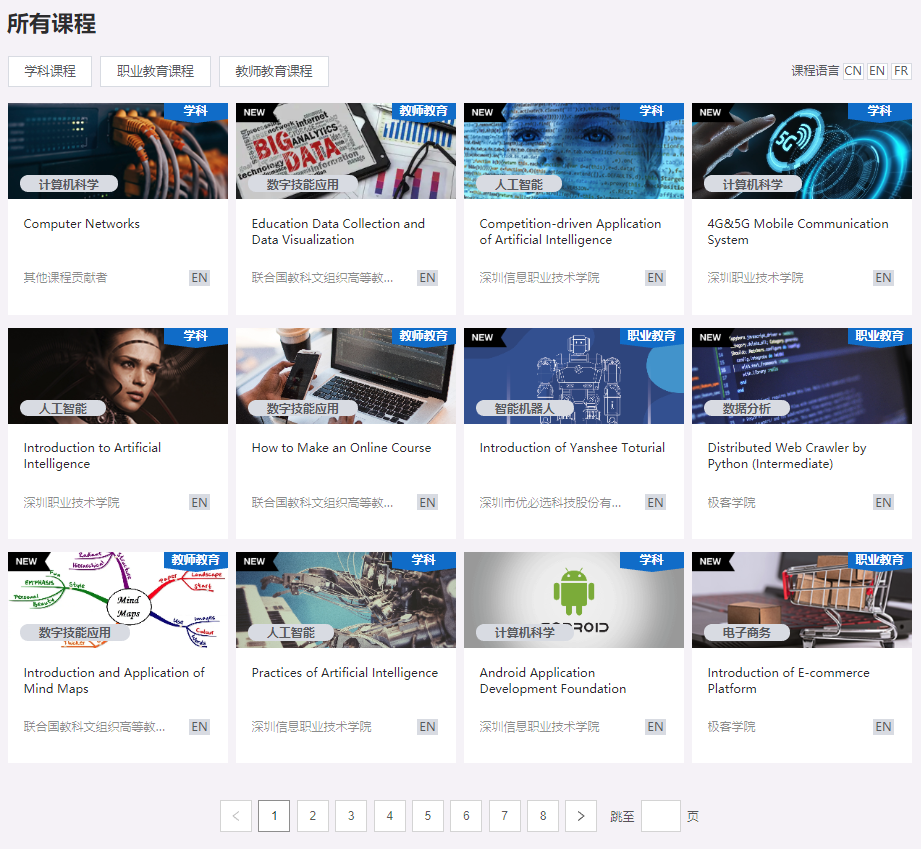 随着新冠肺炎疫情在全球蔓延,各类学校的教育教学工作正在经受前所未有的挑战。为改善发展中国家各类学校教育中断的困境,2020年4月2日,由联合国教科文组织高等教育创新中心(中国深圳)与亚太和非洲11所顶尖高等院校、中国4所高等院校及8家高科技企业共同发起的“国际网络教育学院”(International Institute of Online Education,IIOE)正式在云端发布。IIOE首页 过去三年,创新中心在与亚太和非洲地区发展中国家的高校开展深入合作的过程中,发现这些高校面临的最大挑战是缺乏优质的学习资源,尤其是信息通信技术(ICT)相关的课程资源。在前期需求调研的基础上,IIOE确定以培养教师ICT应用能力为重点,设计了聚焦ICT领域相关的课程,分成学科、职业技术和教师专业发展三个类别,为伙伴院校提供前沿的ICT相关优质在线课程和教师专业发展的机会,促进发展中国家高等教育普及和质量提升。IIOE课程页面 截至目前,已有130多门中英法三语课程上线IIOE平台,涵盖云计算、大数据、物联网、人工智能、区块链、智能机器人、数字图像处理、机器识别、电子商务、企业认证、教师应用