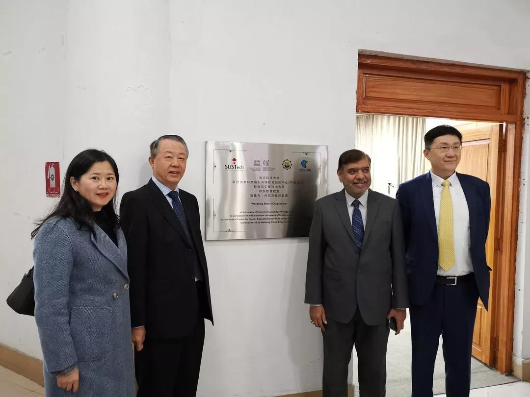 创新中心、南方科技大学、伟东云教育集团和拉合尔工程技术大学四方代表在智慧教室前合影