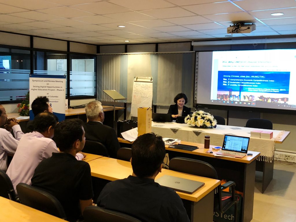 韩蔚教授在会上代表深圳作了题为“深圳信托基金亚洲项目回顾:创新中心对于亚太地区高等教育信息化的构想和经验”的主题报告,取得了在场专家和科伦坡大学的热烈反响。