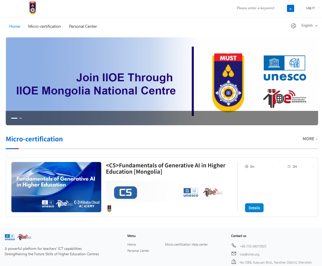 在全球教育数字化转型浪潮中,联合国教科文组织高等教育创新中心(中国深圳)(下称“创新中心”)推出的国际网络教育学院(IIOE)高校教师数字和人工智能素养提升微证书项目(下称“IIOE微证书项目”),正在为发展中国家高校的数字化转型提供重要支持。作为首批参与该项目的试点国家之一,蒙古国深度参与该项目并取得积极成效。IIOE蒙古国家中心承办单位蒙古科技大学(Mongolian University of Science and Technology, MUST)依托IIOE学习平台,以线上+线下的形式,通过级联培训 (cascade training),在短时间内已累计为该国10余所高校的1800多名职前和在职教师提供人工智能素养提升赋能。