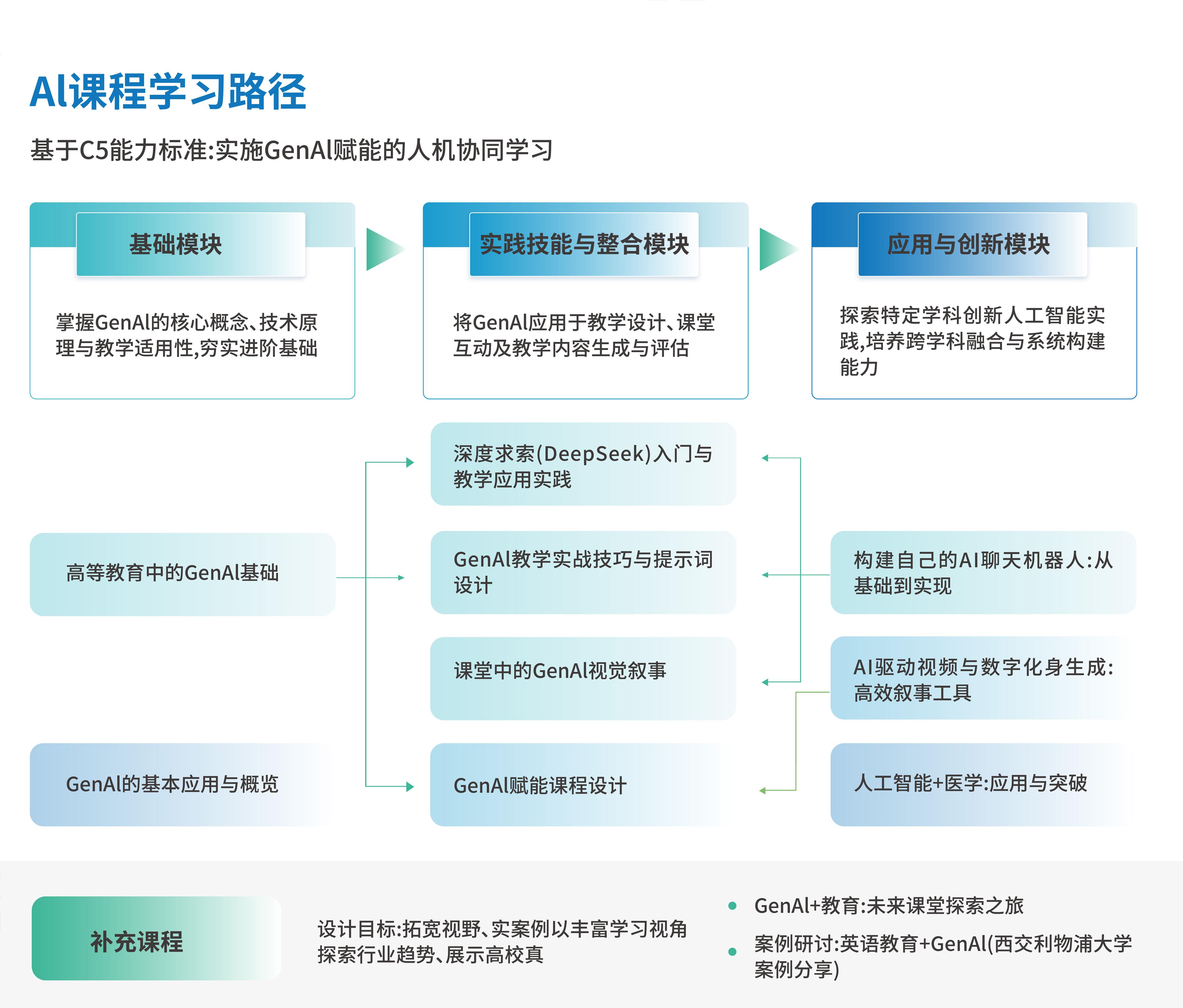 “AI+学科”系列课程与学习路径2025年,IIOE将持续推进“AI+学科”系列课程,通过聚焦实际应用场景和特定领域创新,深入探索人工智能的跨学科整合方式。另外,IIOE精心设计AI专属学习路径,涵盖AI基础理论模块(含核心概念与技术原理)、AI实践技能模块(含技术实操与融合方法)、AI应用创新模块(含跨学科整合和系统构建),系统赋能学习者构建从理论到实践、从技术到创新的全链条能力体系。